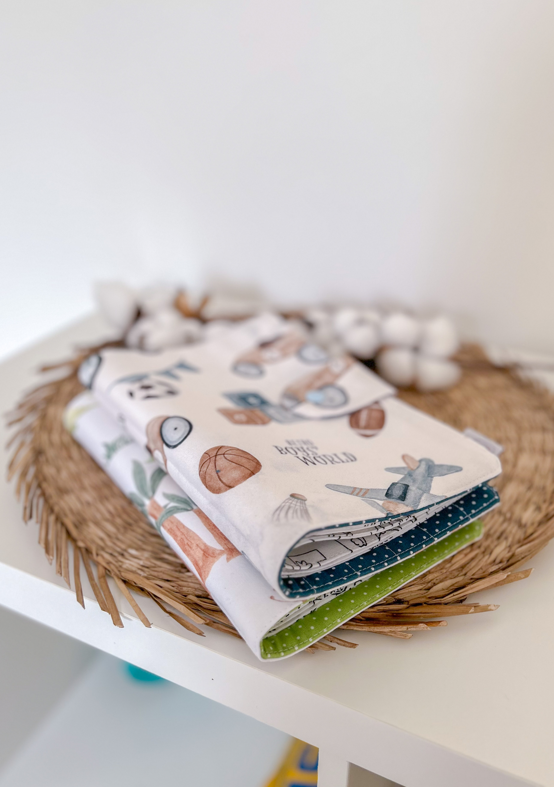 Le livre est composé de tissu en coton. Pour plus de tenue et pour ne pas que les feutres traversent, les pages sont thermocollées.
