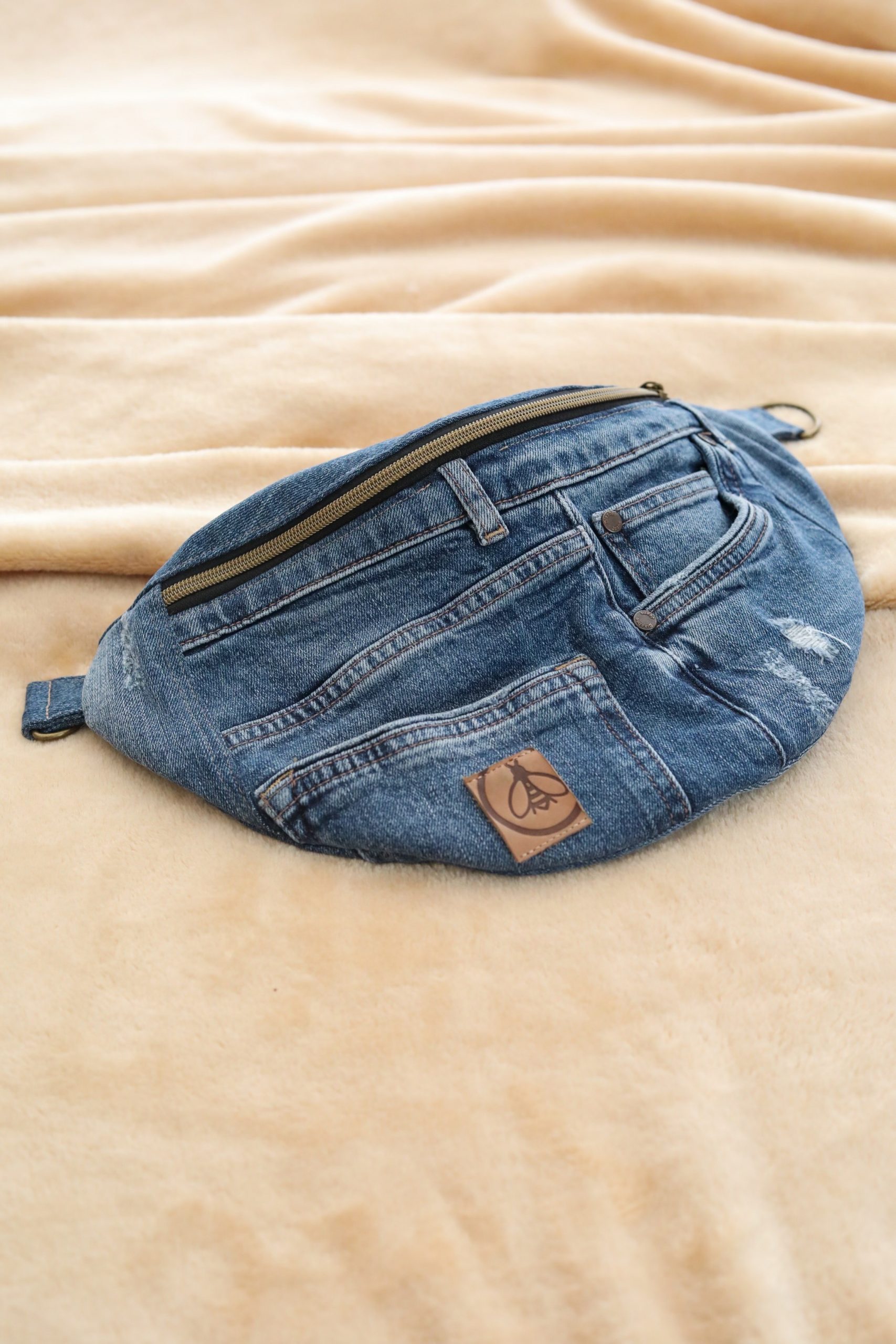 Le sac banane est composé d’un ancien jeans et d’un tissu en coton.
